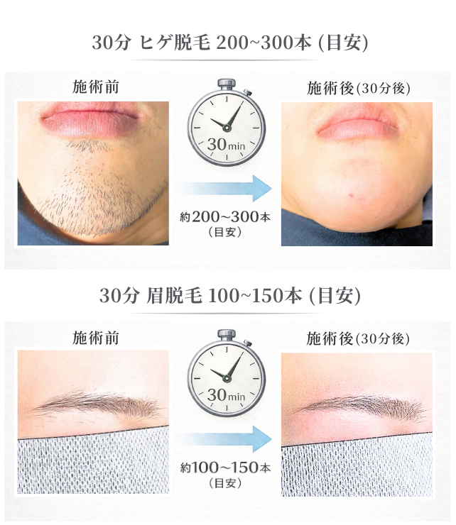 ※30分コースの目安の脱毛本数は密度のあるヒゲで200~300本ほど。その他の部位で100~200本ほどです。脱毛部位やお客様の毛の状態によって脱毛本数は変わります。ご了承くださいませ。